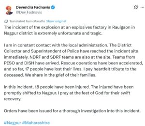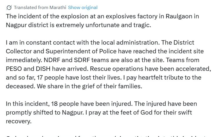 करते हुए लिखा, “…NDRF और SDRF की टीमें भी मौके पर हैं। 17 लोगों की जान चली गई है। मैं मृतकों को दिल से श्रद्धांजलि देता हूं। इस घटना में 18 लोग घायल हुए हैं। घायलों को तुरंत नागपुर शिफ्ट कर दिया गया है। इस घटना की पूरी जांच के आदेश दे दिए गए हैं।”