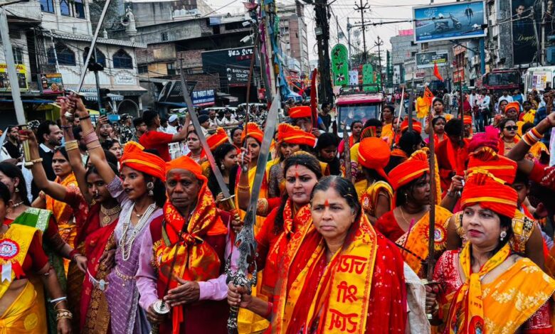 दैनिक आवाज न्यूज, रांची: नारी सेना श्री महावीर मंडल के तत्वावधान मे रामनवमी शोभायात्रा झांकी धूमधाम से बाजे गाजे के साथ पहाड़ी टोला से निकाली गई जिसका समापन ओवरब्रीज निवारणपुर में हुई। सेना की केंद्रीय अध्यक्ष पूनम सिंह ने इस झांकी का नेतृत्व किया। इस झांकी में रातु,चुटिया,पुनदाग,देवी मंडप रोड,पहाड़ीटोला,रेलवे कॉलोनी, न्यू मधुकम,विद्यानगर,बुटीमोड़ आदि के 501 महिलाएं शामिल होकर लाठी तलवार भांजे और श्रीराम जानकी,बजरंगबली जी की जयकारे लगाए।